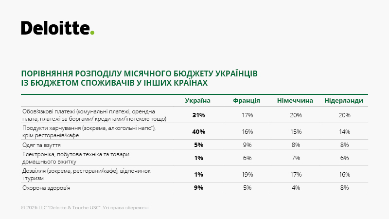У межах дослідження Deloitte Ukraine було проведено порівняння структури витрат українців із бюджетами споживачів в інших країнах. Дані демонструють суттєву різницю у розподілі витрат між українцями та жителями європейських держав.