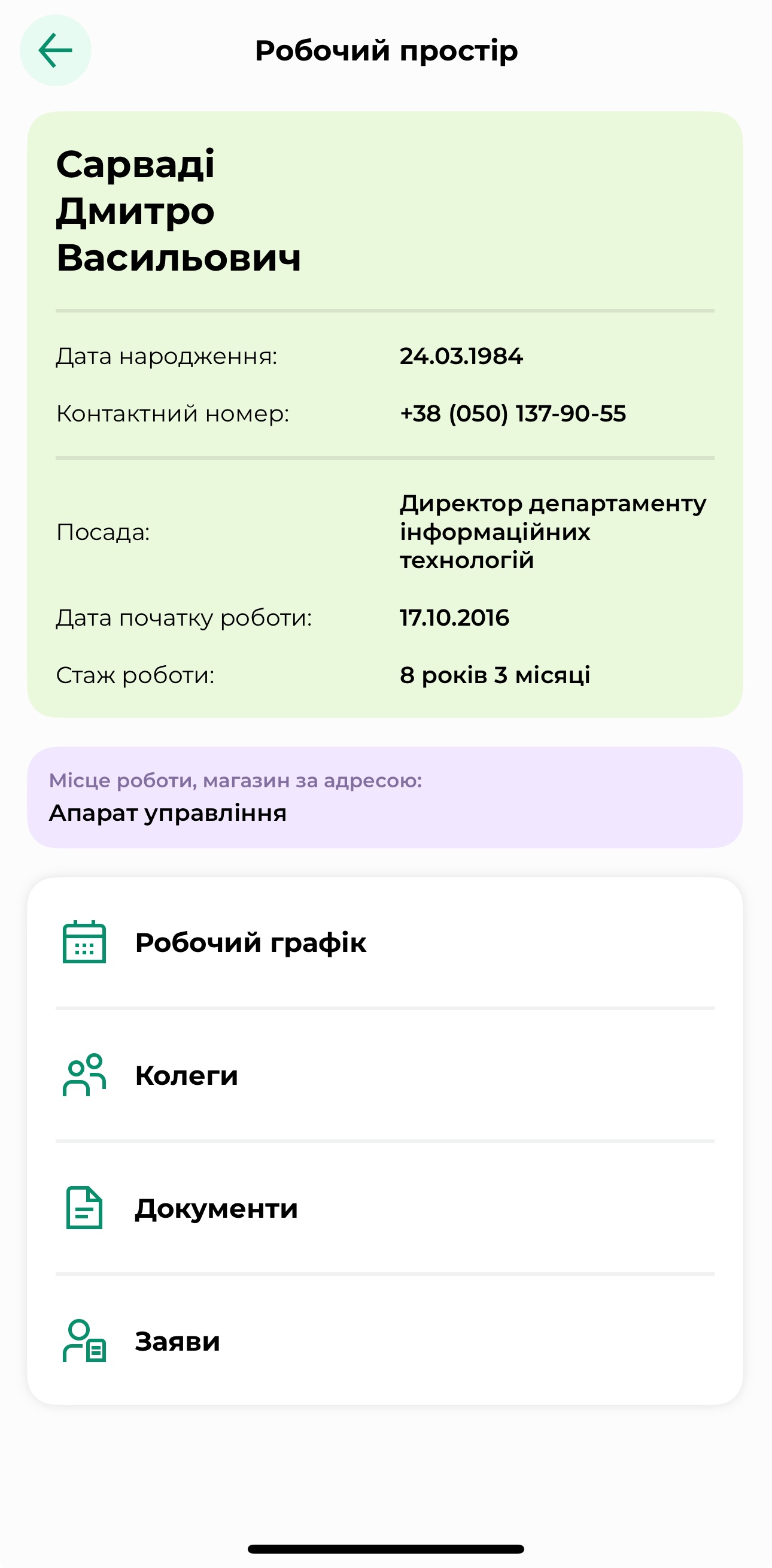 Також у мобільному застосунку з’явився «кабінет співробітника» в якому працівники бачать свій стаж, графік роботи, особливо це актуально для співробітників магазину, які бачать графік роботи з розділенням по робочих зонам протягом дня. В кабінеті співробітника є можливість подання заяв на відпустку, планується через цей кабінет реалізувати повний цикл працівника від анкети, при прийомі на роботу, до звільнення. Всі заявки, та документи підписуються через Дію. Всі процеси погодження заяв, відбуваються на платформі Microsoft 365.