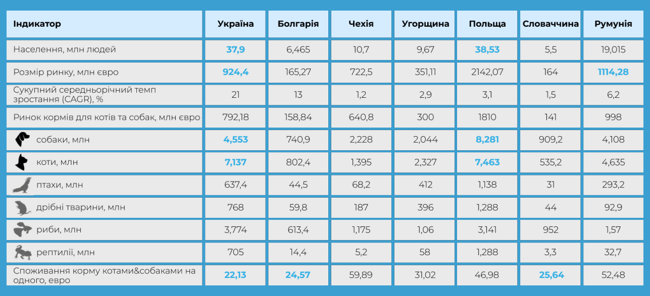 一 Попри війну та інші чинники, за даними Euromonitor International, український зооринок розвивається найбільш динамічно в Східній Європі. Його обсяг у мільйонах євро значно випереджає Болгарію, Чехію, Угорщину та Словаччину.