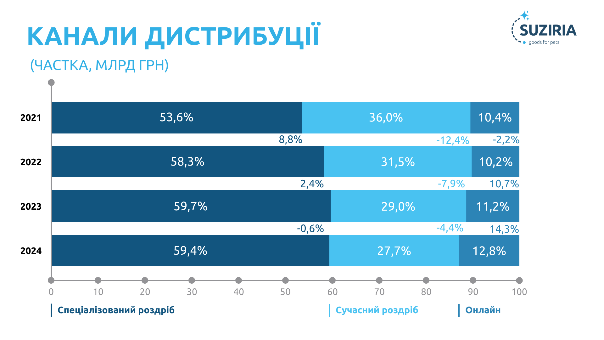 一 Suziria Ukraine, як частина групи компаній Suziria Group та топ-оператор ринку зоотоварів, працює з-понад 6000 B2B-клієнтами, які представляють усі канали продажів — спеціалізовані зоомаркети, супермаркети, а також онлайн-платформи.