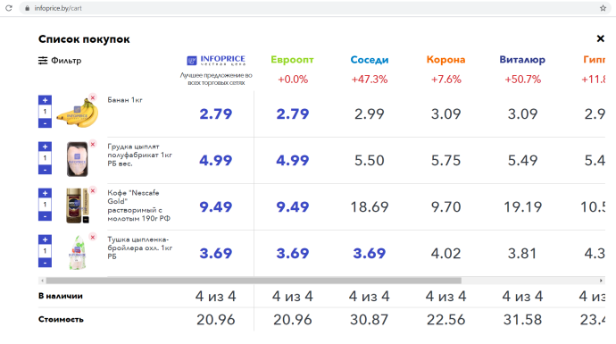 Ціни для «розумного» кошика відстежують щодня. Моніторингом охоплено більшість торговельних мереж: «Евроопт», «Соседи», «Корона», «Виталюр», «Гиппо» та Green. Для порівняння представлені і онлайн-гіпермаркети, але поки тільки «ХИТдоставкой».