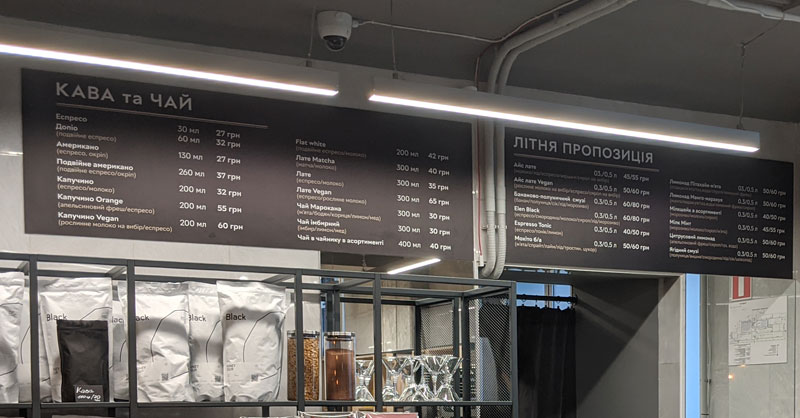 В приміщенні є стійка з кондитерськими виробами і кілька столиків для відвідувачів. Ціни на напої в кав'ярні, для прикладу, капучіно на 200 мл коштує 32 грн, а еспресо на 30 мл — 27 грн.