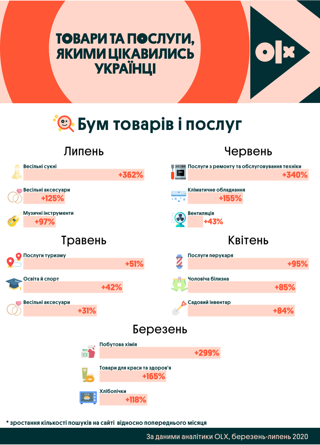 Згідно з аналітикою OLX, у травні стало більше зацікавлених у послугах туризму (+51%) та освіти й спорту (+42%). Окрім того, не дивлячись на карантин, українці не забули про весільний сезон – адже зацікавлених у купівлі весільних аксесуарів у травні стало на 31% більше. З наближенням літнього періоду також стало більше тих, хто шукав послуги з оздоблення та ремонту (+28%) та встановлення кондиціювання (+28%).