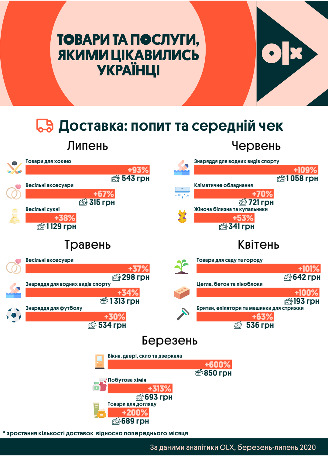 В середині літнього сезону відбувся «бум» серед зацікавлених у весільній атрибутиці – сукнях (+362%) та аксесуарах (+125%). Українці стали також пробувати нові хобі та активніше шукати музичні інструменти – на 97%. Не можна також не відзначити зростання інтересу до повітряного (96%) та комунального транспорту (93%).