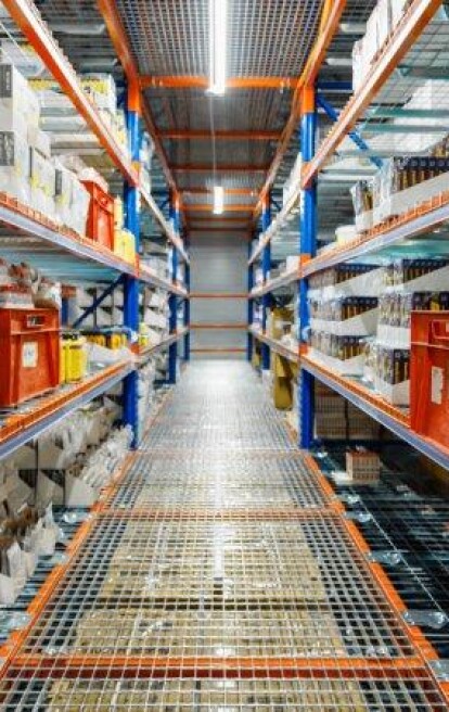 Новий мезонінний комплекс на складі БМК у Броварах* складається з п’яти поверхів, площа кожного з яких становить 800 м2. Це багатоярусна металева стелажна конструкція, що забезпечує організацію додаткових рівнів у приміщенні складу. На кожному її рівні розташовані комірки для зберігання товарів і організовані зони для підготовки замовлень. Мезонін складається з більше 30 000 комірок, кожна з яких витримує навантаження до 300 кг.