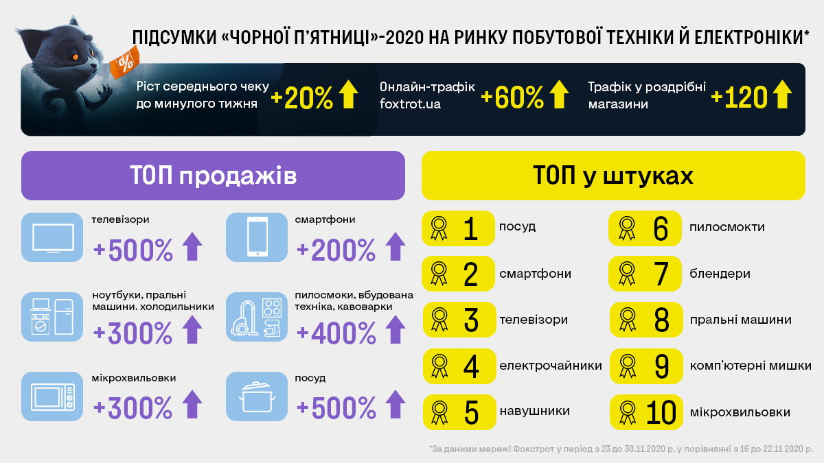 За даними Foxtrot.ua, за тиждень Чорної п’ятниці онлайн-трафік зріс на 60% (у співвідношенні рік до року і тиждень до тижня). Трафік в офлайн-магазини виріс на 120% в порівнянні з попереднім тижнем і прогнозовано у зв’язку з карантином вихідного дня скоротився на 20% в порівнянні з минулим роком. Також виправдалися прогнози щодо збільшення частки онлайн-продажів до 20% від товарообігу компанії. Середній чек в цей період виріс на 20% в порівнянні зі звичайним тижнем.