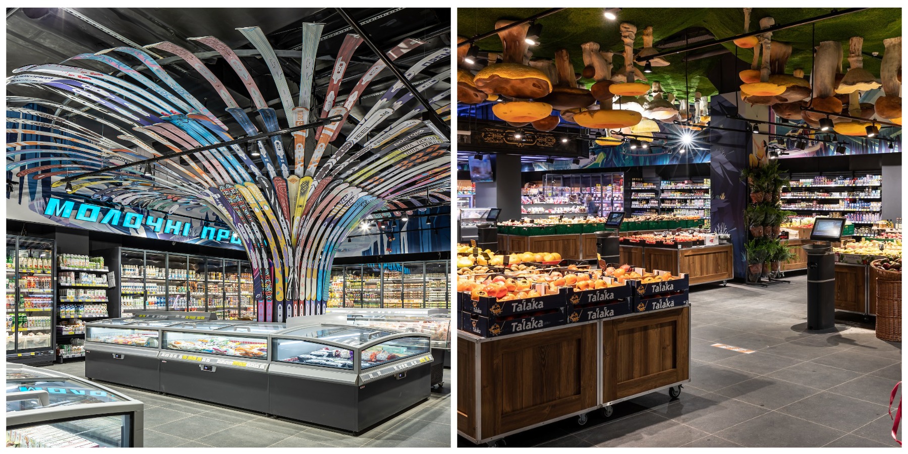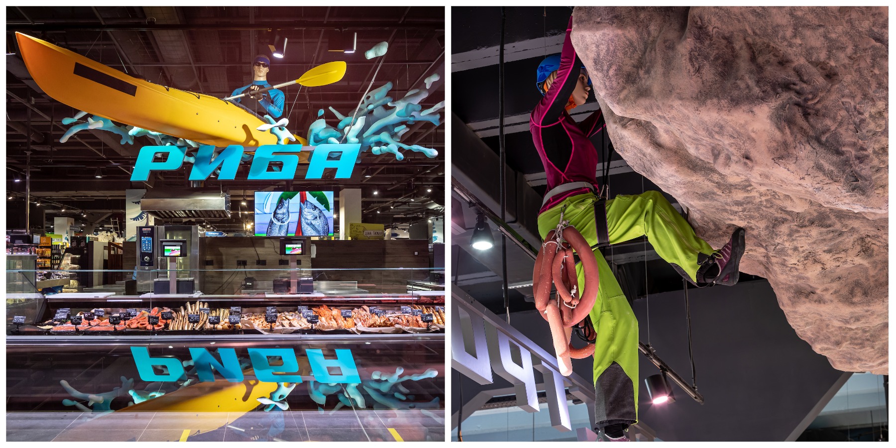 1800 кв. м торгового залу розділено на літні та зимові гірські види спорту й розваги. Туристичний маршрут у «Сільпо» спочатку проходить під дельтапланами. Потім – грибною поляною і повз величезний кошик лохини у відділі овочів та фруктів. На горі в гастрономії шукайте скелелазів, які доповнили своє спорядження ковбасками і сиром. Зробіть зупинку, щоб довше вибирати свіжу рибу — так ви поспостерігаєте за динамічною інсталяцією фрірайдера в каяку. Далі у м’ясному і молочному відділах на вас чекають засніжені траси з лижниками та сноубордистами. Перепочити можна біля піцерії, яка має точнісінько такий вигляд, як колиба біля станції витягу в Буковелі.