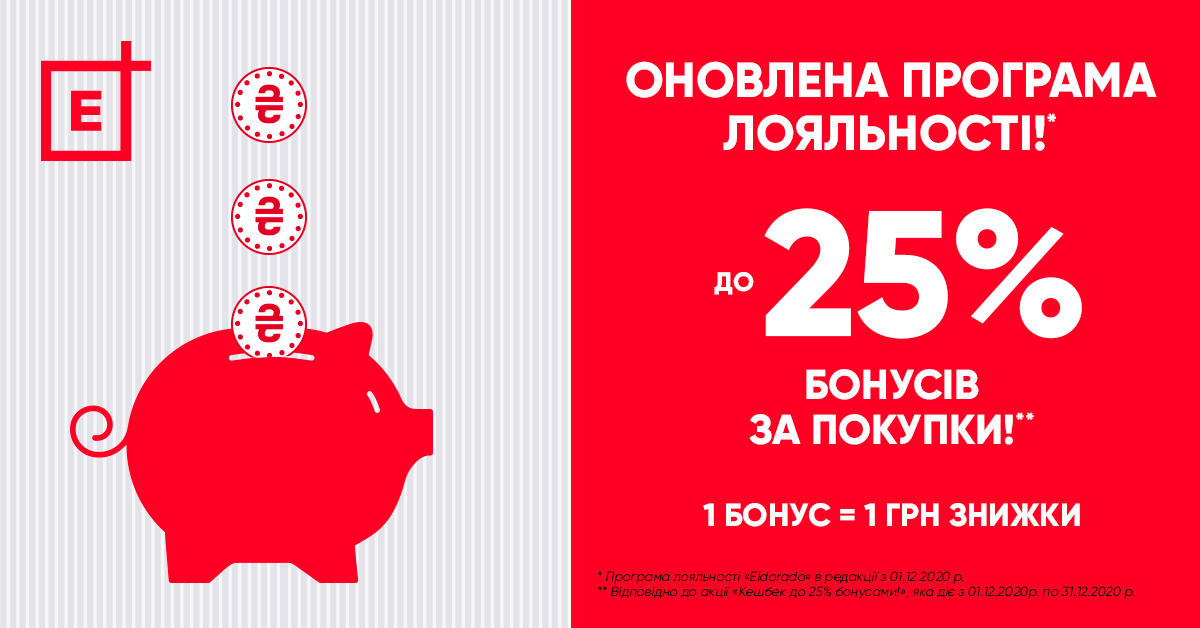 У новій програмі лояльності Eldorado учасники отримують бонуси. Зокрема, при покупці акційних товарів нараховуються бонуси в розмірі до 25% від суми чека. Також можна отримати бонусами 15% від суми покупки в день народження клієнта, а ще в рамках оновленої програми буде діяти нарахування 1% від вартості покупок. 1 бонус еквівалентний 1 гривні знижки на наступну покупку. Таким чином, участь у програмі лояльності дозволяє клієнтам отримати додаткову вигоду при наступних покупках.