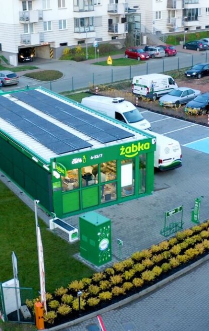 Фотовольтаїка і використання технології квантових точок, кінетична підлога, яка перетворює кроки в енергію, протисмогова бруківка, доповнена зеленою стіною з рослин, яка поглинає пил і смог — це лише деякі з інноваційних рішень, використані в магазині Żabka по вул. Левандув в Варшаві. Перед магазином також є ЕКОмат і зарядна станція для електромобілів.
