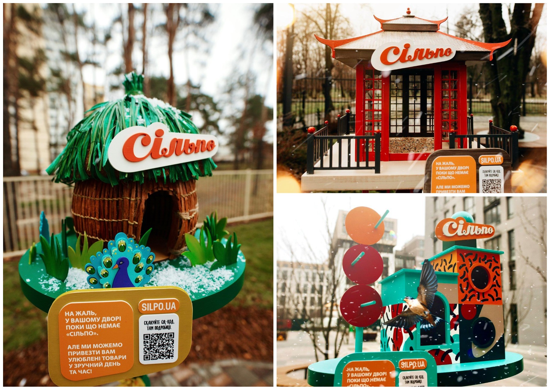 Перші п’ять годівничок уже встановлено біля київських житлових комплексів, поряд з якими немає «Сільпо», але є можливість пройти за QR-кодом і замовити доставку з інтернет-магазину.