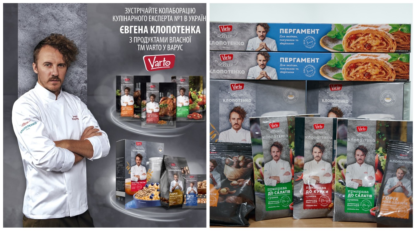 Мережа супермаркетів VARUS вже представила першу ексклюзивну лінійку продуктів ТМ VARTO, розроблених у співпраці з Євгеном Клопотенко. На сьогоднішній день у продажі зʼявилися спеції в асортименті, вівсяні пластівці, горіх макадамія, кедровий горіх, пекарській папір і фольга. Покупець легко ідентифікує дану продукцію — в новому дизайні упаковки продуктів ТМ VARTO інтегрований та впізнаваний образ кулінарного експерта і візуальні атрибути бренду. У цьому дизайні будуть виконані і всі наступні новинки ТМ VARTO.