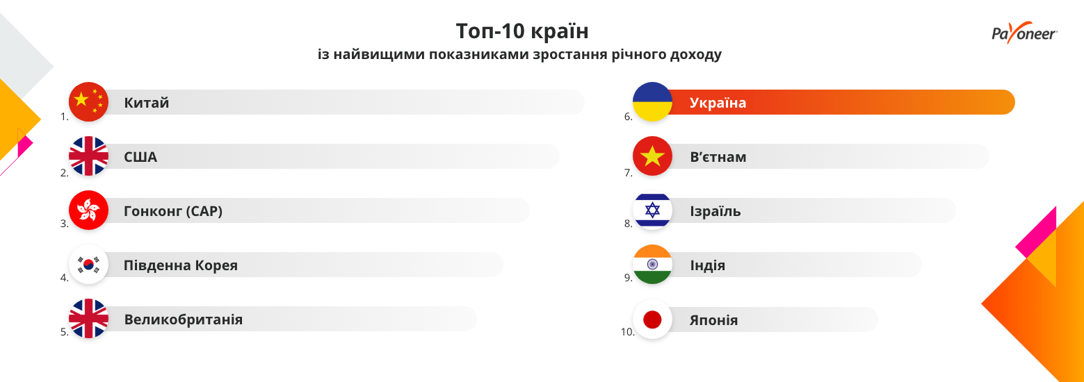 Про це йдеться у звіті Payoneer’s Global Seller Index, який охоплює II та III квартали 2020 року. Наша країна посіла шосту позицію в рейтингу, випередивши В’єтнам, Ізраїль, Індію та Японію, але поступившись Китаю, США, Гонконгу, Південній Кореї та Великобританії.
