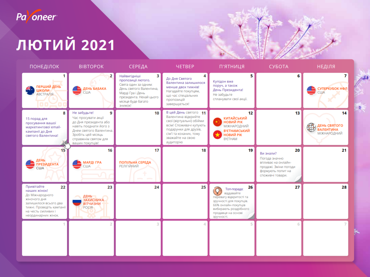 Однак дізнатися та запам'ятати всі святкові дати може бути важко. Щоб вони завжди були під рукою, і підготовка відбувалась легше, Payoneer створив календар для e-commerce на 2021 рік.