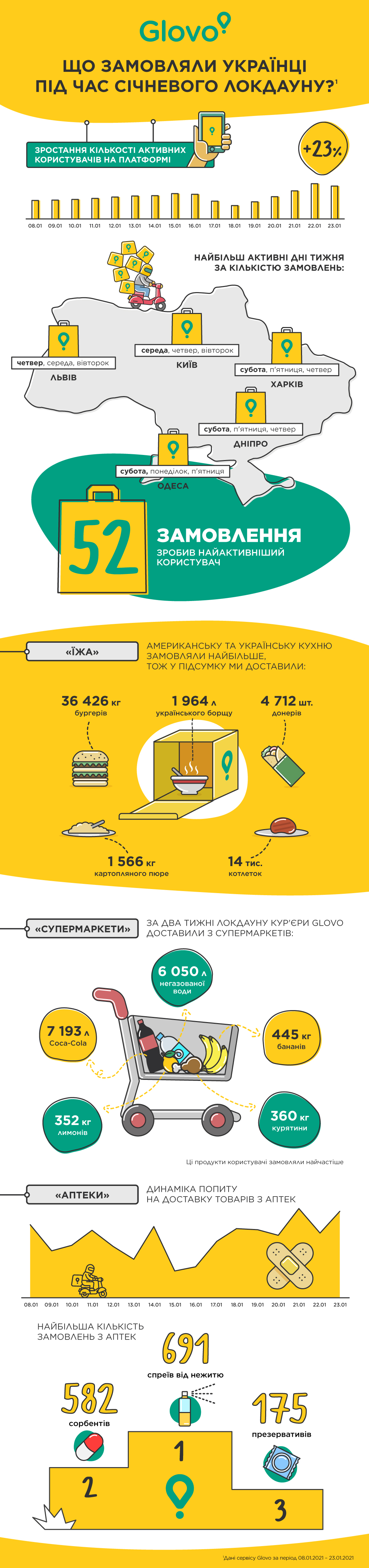 Для підготовки інфографіки були використані дані платформи Glovo за період 8-23.01.2021 р.