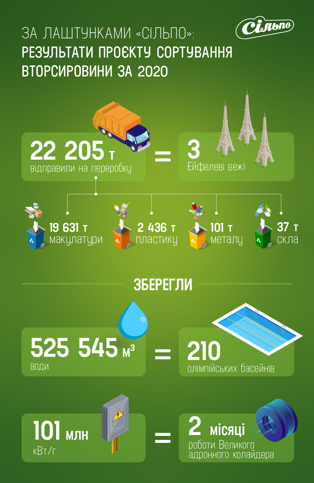Роздільне збирання відходів «Сільпо» здійснює за чотирма основними категоріями: макулатура, метал, пластик і скло. Зокрема, протягом 2020-го на перероблення пішли: