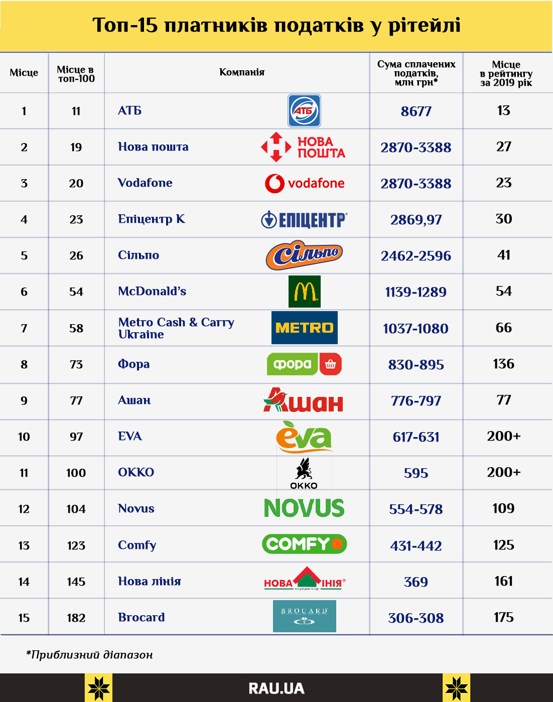 В першу десятку платників традиційно входять підприємства нафтогазової та енергетичної сфер, виробники тютюну, держмонополії, такі як Укрзалізниця. Але вже на 11-му місці знаходиться найбільша мережа продовольчого рітейлу — АТБ. Лідер серед рітейлерів за розміром сплачених податків перерахував до бюджету майже 8,68 млрд грн. Його вклад в бюджети всіх рівнів за рік виріс на 28% в порівнянні з показником 2019 року. Це дозволило мережі потіснити в рейтингу державний Приватбанк і піднятися за рік відразу на дві позиції: з 13-го на 11-е місце.