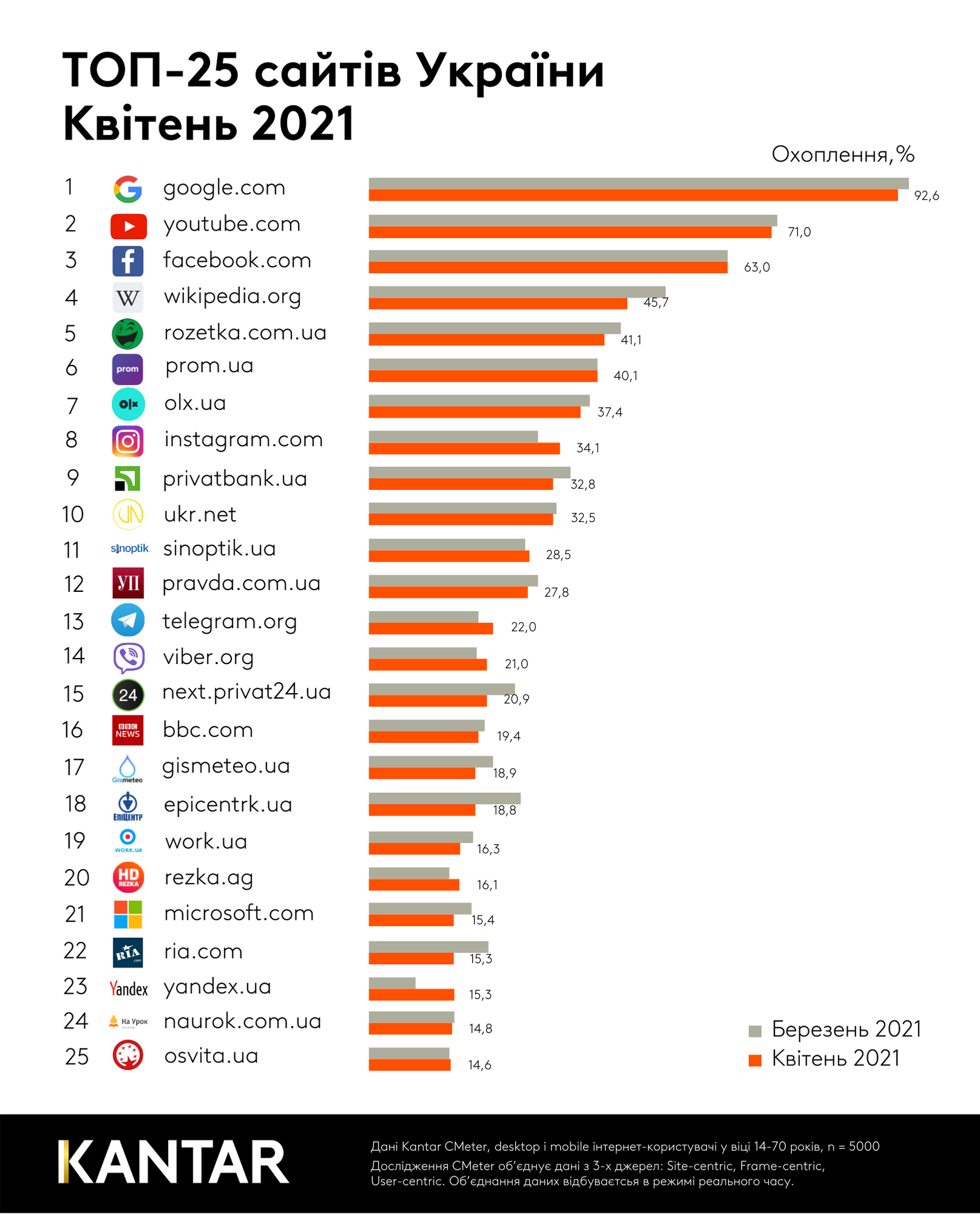 Rozetka, Prom та Olx увійшли в топ-25 сайтів українського інтернету за квітень