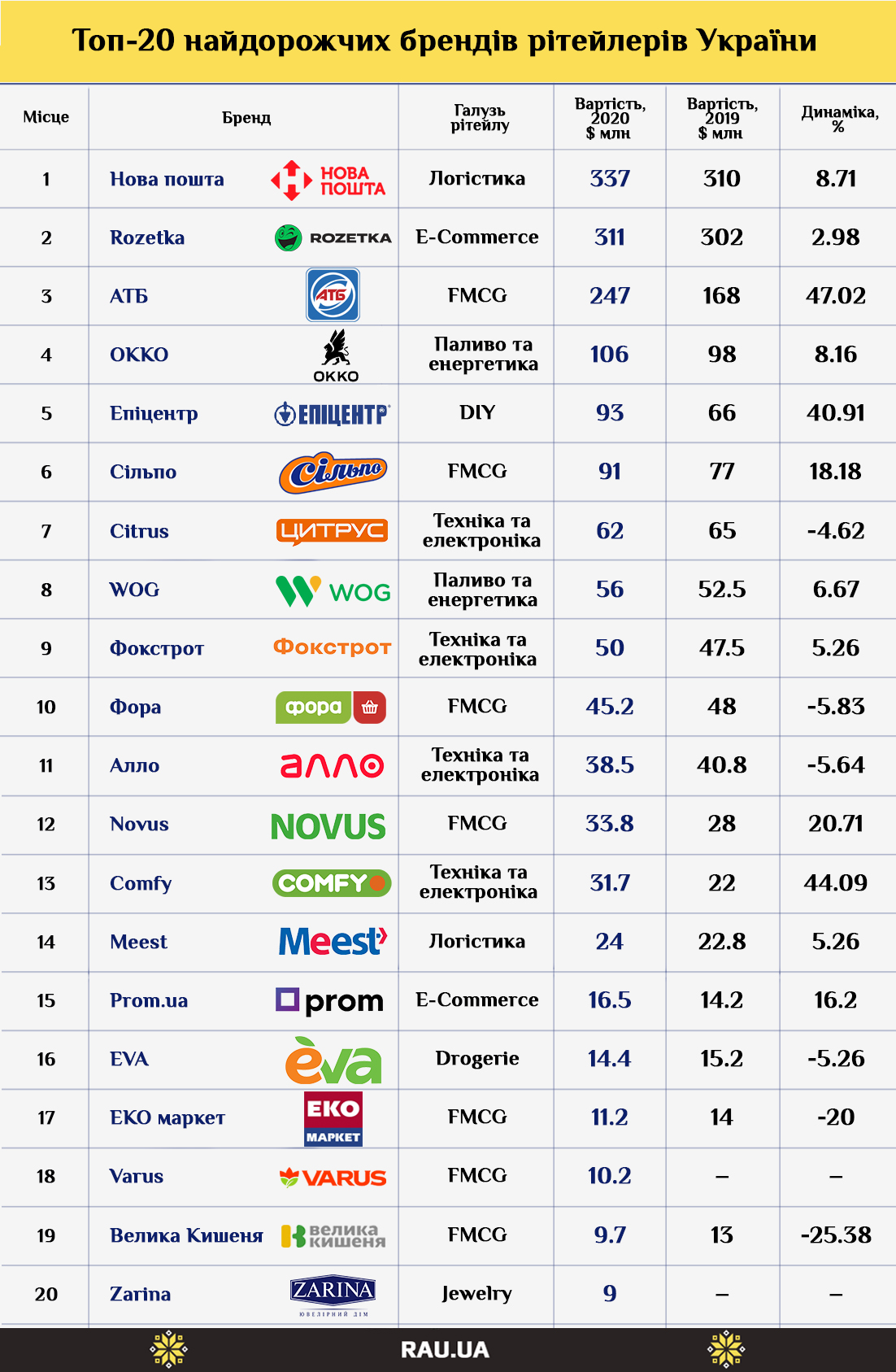 Лише чотири компанії перетинають позначку в $ 100 млн вартості бренду — Нова пошта, Rozetka, АТБ та ОККО. Ще дві — Епіцентр і Сільпо — близькі до цієї цифри. Також, серед інших компаній, крім Rozetka, потіснився ще один ecommerce-гравець — компанія prom.ua, яку експерти оцінили в $ 16,5 млн. Замикають 20-ку бренди Велика Кишеня і Zarina, вартість кожного оцінюють в суму близько $ 10 млн.