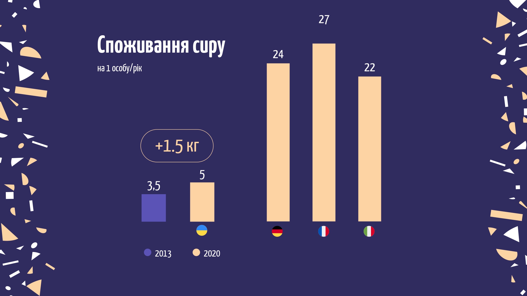 1. Поступово збільшувати обсяг споживання сиру. Наприклад, в Україні на одну людину в рік припадає пʼять кілограмів сиру. Для порівняння, у Франції цей показник — 27 кг.