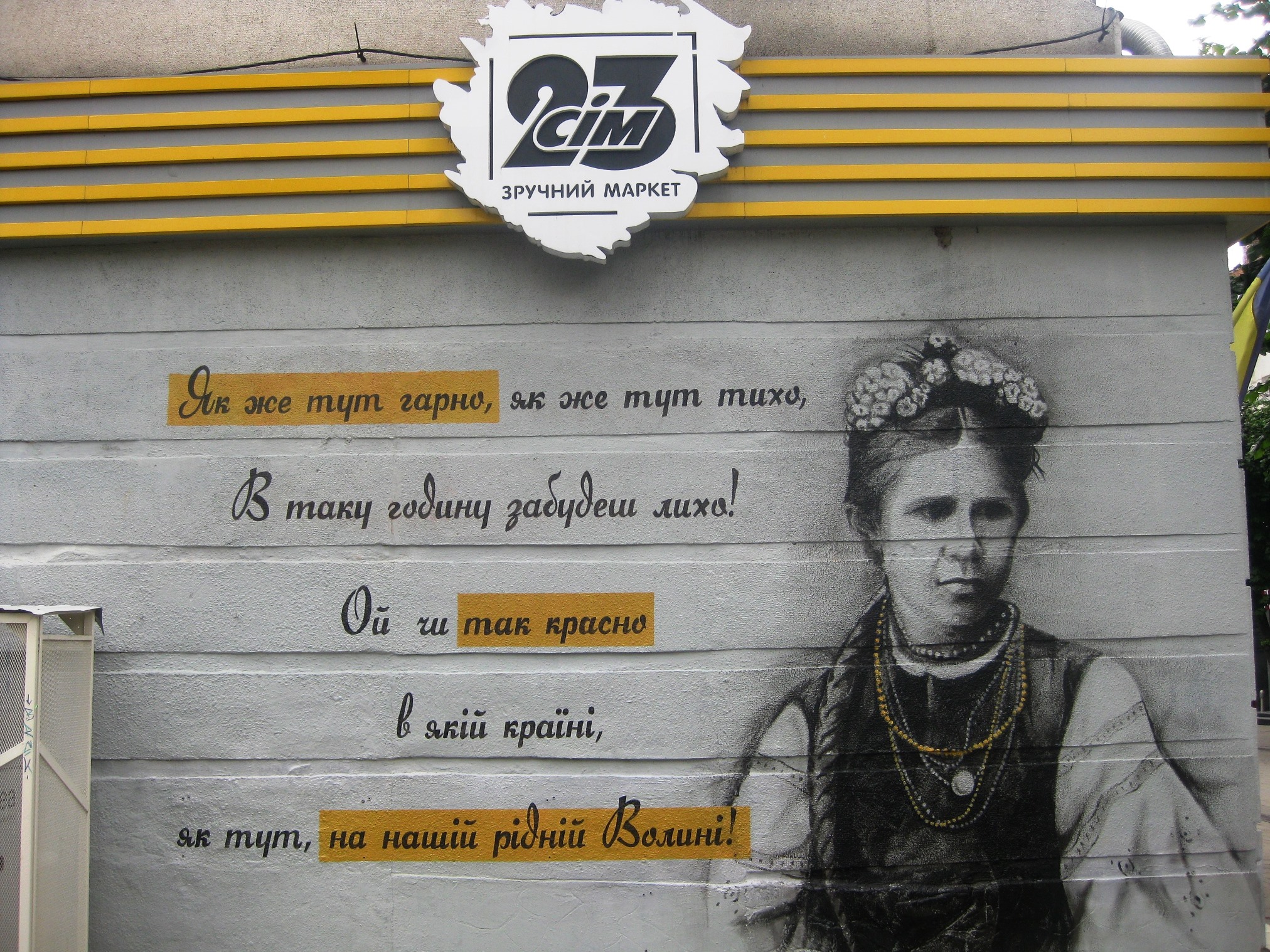 Мурал із портретом письменниці Лесі Українки та цитатами з її поезії з’явився на стіні луцького магазину «Сім23». Він, до речі, знаходиться на вулиці Лесі Українки.