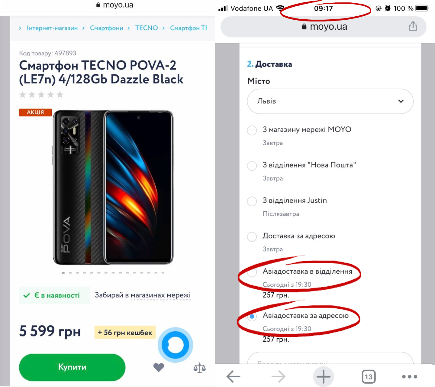 Отримати замовлення можна трьома різними способами: в магазинах MOYO, на партнерських АЗС ANP, АВІАС плюс і УКРНАФТА або адресною доставкою до дверей. Єдина умова: вага покупки не повинна перевищувати 30 кг. За даними з сайту MOYO, вартість екстрадоставки стартує від 200 грн і залежить від ваги товару.