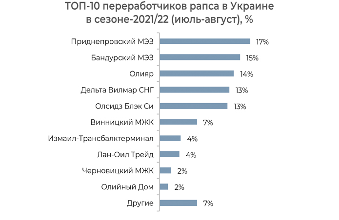 «У поточному сезоні з нових варто виділити «Придніпровський ОЕЗ» (компанії «Кернел» - ред.), що традиційно займається переробкою соняшника, який за підсумками липня-серпня 2021/22 МР очолив рейтинг переробників ріпаку з часткою 17%», — зазначила експерт .