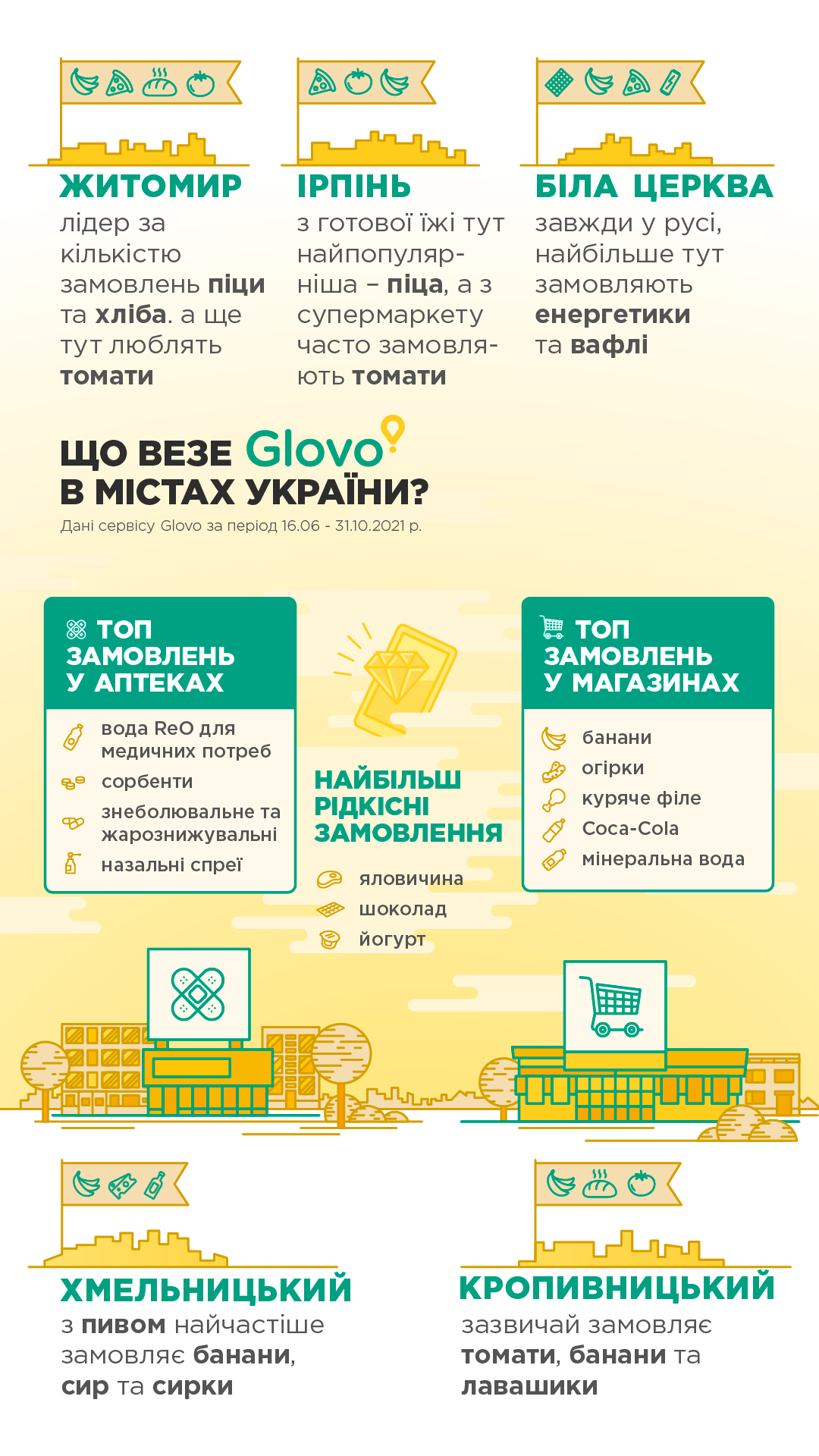 Сервіс Glovo доставляє в Україні вже три роки та щороку робить зрізи замовлень у всіх містах, де присутній сервіс. Цього року компанія ділиться даними замовлень користувачів сервісу в малих міст додатку з бабблів “Супермаркети” та “Здоров’я та краса”.