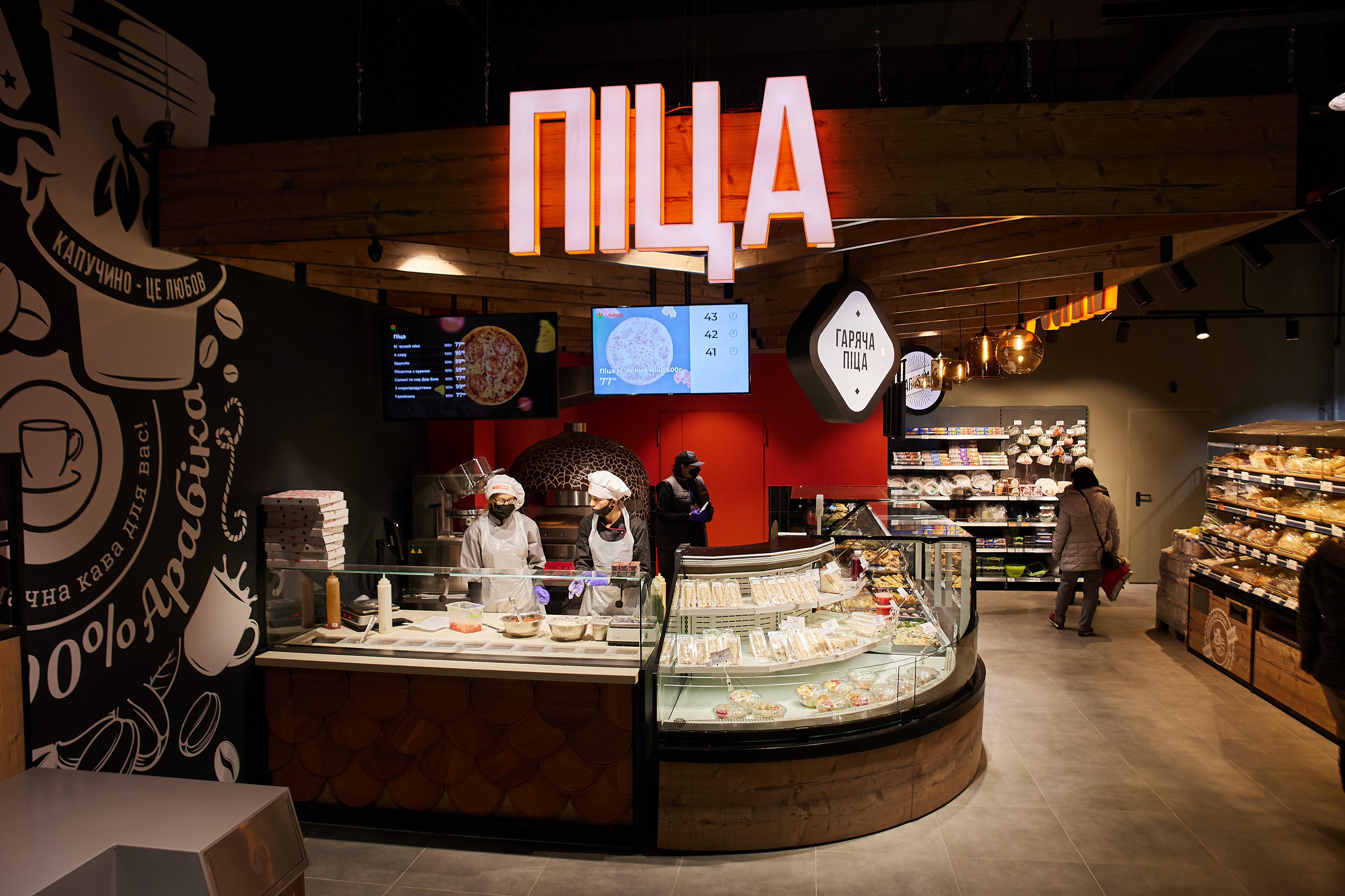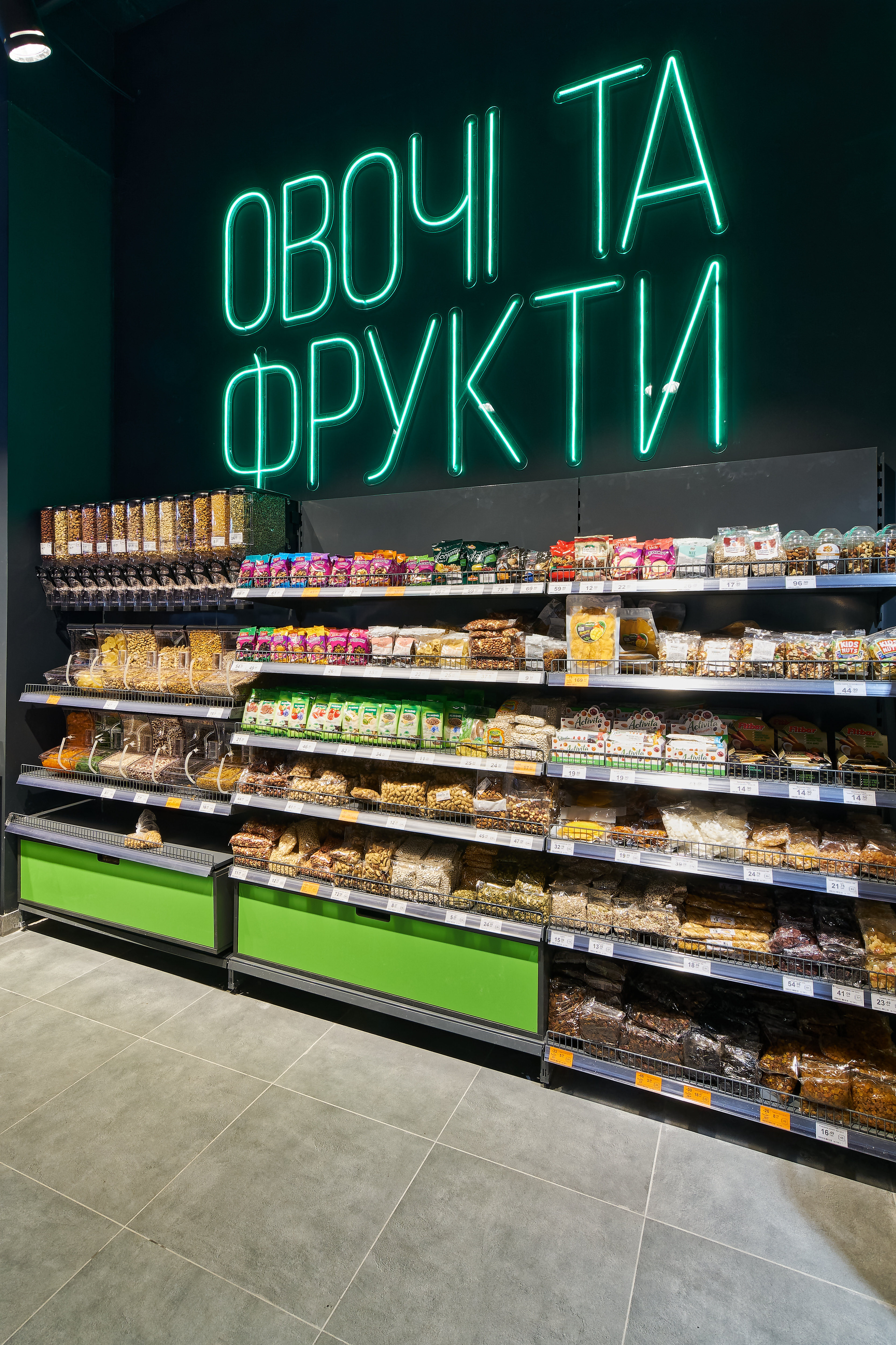 Інтер’єр магазину прикрасили підвісними дерев’яними конструкціями та освітили стильними лампами. На полицях магазину свіжі овочі, фрукти, м’ясні делікатеси, ковбаси та сири з різних країн світу. Вся продукція не залишить байдужим навіть найвибагливішого гурмана.