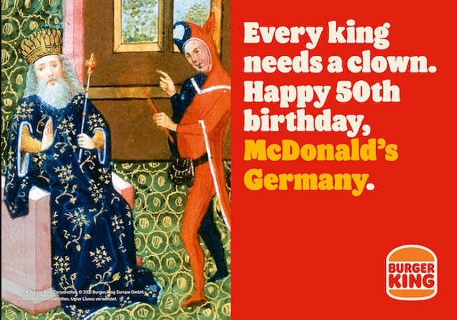 Перший заклад McDonald’s з’явився в Німеччині 4 грудня 1971 року. На честь цього ювілею Burger King запустив кампанію під девізом «Кожному королю потрібен клоун». Для неї створили зображення короля та його блазня, а праворуч написали гасло.