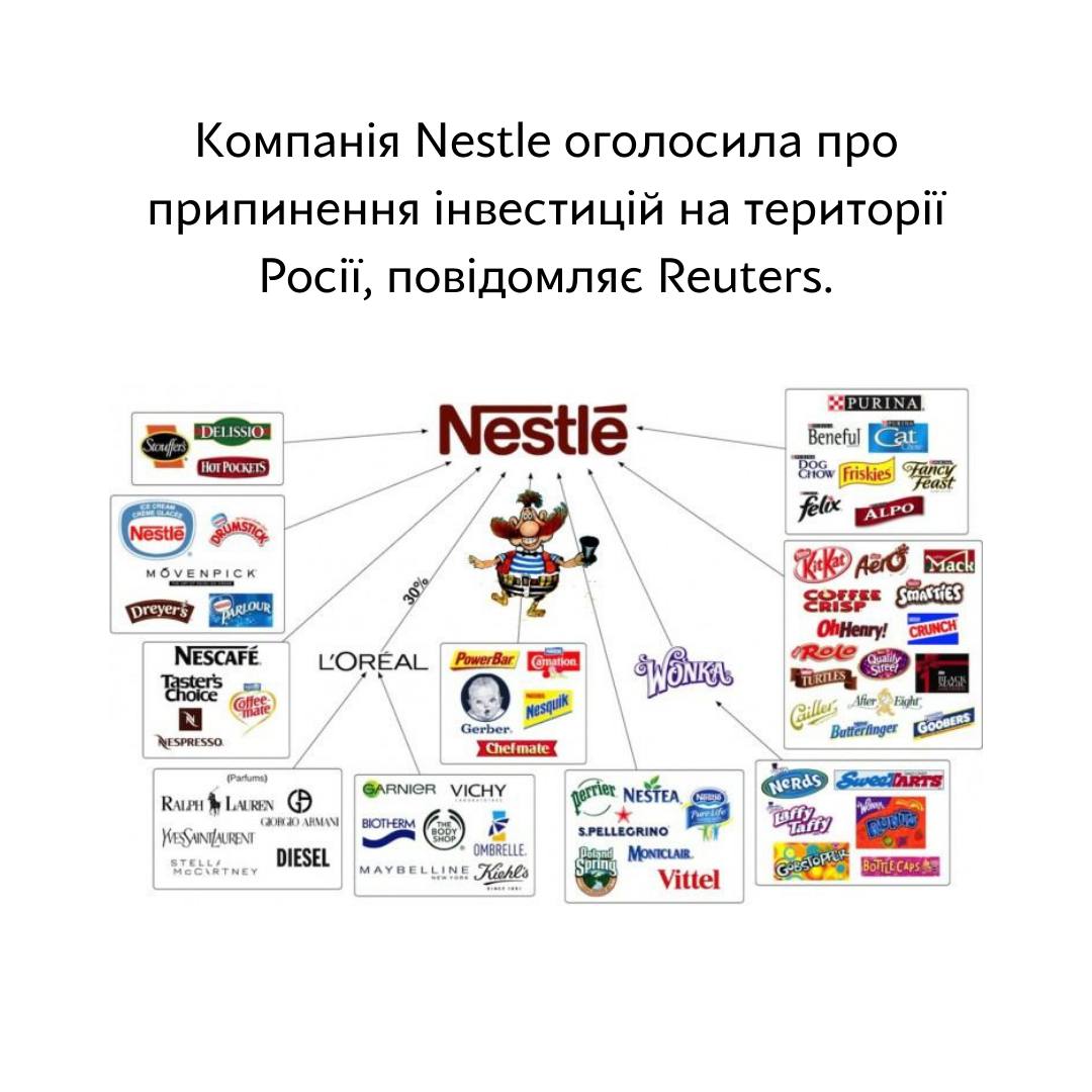 "Nestle, яка раніше заявляла, що припинила всю рекламу в Росії, повідомила, що продовжить постачати найнеобхідніші продукти харчування в Росію, дотримуючись аналогічної політики інших харчових компаній", — пише агентство.