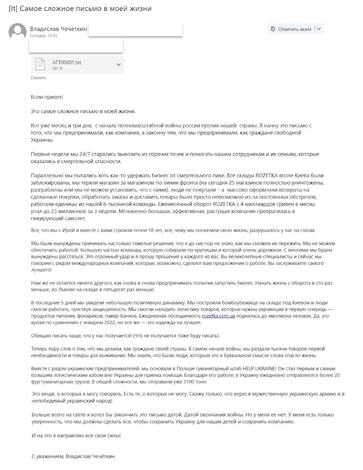 «Все, що ми разом з Ірою (Ірина Чечоткіна, співвласниця Rozetka — ред.) і разом з вами будували майже 18 років, все, чому ми присвятили все життя, було знищено у нас на очах», — йдеться у листі Владислава. Чечоткін запевняє, що спробує знову запустити бізнес у Львові, на складі розміром в п’ятдесят разів менше.