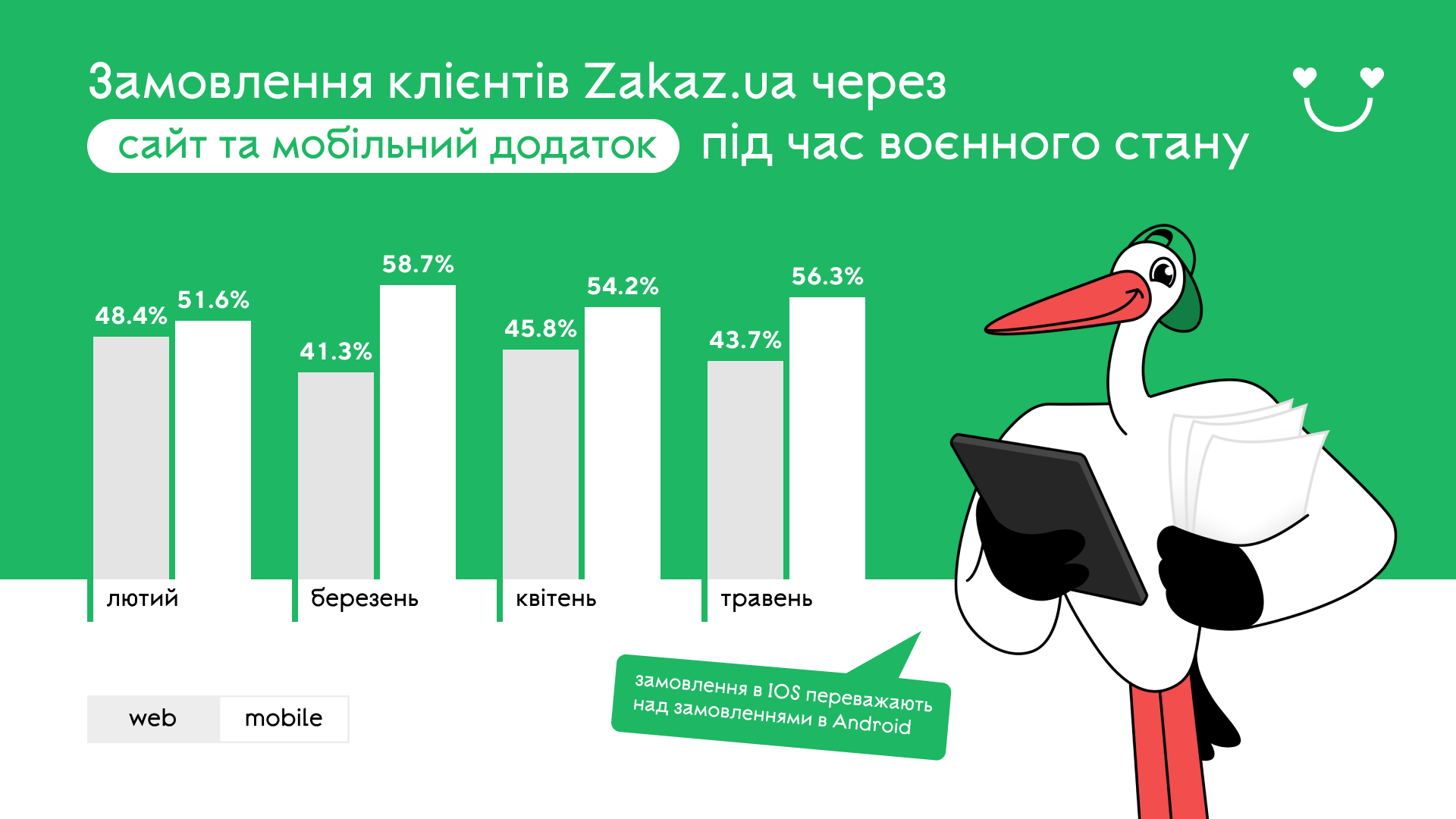 Для зручності Клієнтів Zakaz.ua, у січні 2020 був створений мобільний додаток одразу на двох платформах: iOS та Android. Зазначимо, що раніше користувачі сервісу могли робити замовлення лише через вебсайт. Наразі додаток має значний попит і кількість нових користувачів щодня зростає. Наприклад, у 2020 році 76,7% з усіх клієнтів замовляли через сайт сервісу, а мобільний додаток використовували 23,3% клієнтів. У 2021 році ситуація змінилася на користь програми, де частка на користь застосунку замовлень підвищилася до 46%. З початком повномасштабної війни тренд на використання мобільного додатку суттєво зріс та стабільно перевищує показник на понад 50%. У лютому 2022 через мобільний додаток було зафіксовано 51,6% замовлень від клієнтів, у березні показник сягнув піку — 58,7%. Варто зазначити, що кількість замовлень від користувачів додатком IOS переважають над кількістю замовлень від користувачів Android.