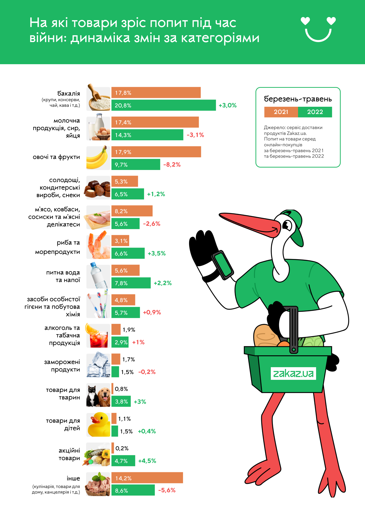 Під час війни в Україні серед онлайн-покупців сервісу Zakaz.ua суттєво зріс попит на бакалійні товари: крупи, макарони, борошно, цукор, сіль, соняшникову олію, консерви, чай та каву. З березня по травень 2022 доля замовлень серед усіх категорій на цю групу товарів становить 20,8%, тоді як за аналогічний період у 2021 була 17,8%. Така тенденція не є дивною, адже багато українців в кризові часи запасаються поживними та необхідними продуктами довготривалого зберігання. Крім цього, варто зауважити, що дуже помітно зріс попит на категорію акційних товарів — на 4,5%. У весняний період минулого року ця категорія мала показник попиту 0,2%, тоді як зараз зросла до 4,7%. Такі зміни пов’язуємо з падінням рівня доходів населення через війну. Українці заощаджують кошти, тому почали частіше купувати товари зі знижками.
