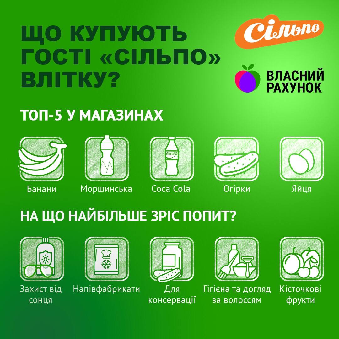 Завдяки аналітичним даним програми лояльності «Власний Рахунок», з’ясувалося, що українці збільшили попит на свіжий урожай цього року: ранні овочі, сезонні фрукти і ягоди. Також традиційно популярними серед гостей «Сільпо» залишаються товари масового вжитку — яйця, банани, солодка та мінеральна вода.