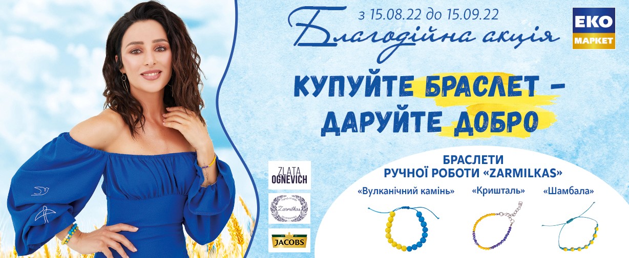 З 15 серпня в усіх магазинах мережі «ЕКО Маркет» в м.Київ та Київській області стартувала спільна з українською співачкою Златою Огнєвич благодійна акція «Купуйте браслет – даруйте добро». Місія проекту — допомогти жінкам та дівчатам, що постраждали від війни.