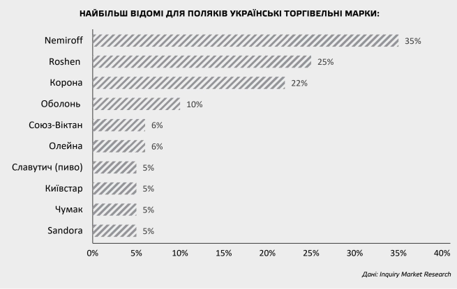 Згідно з останнім звітом польської дослідницької компанії Inquiry “Marki ukraińskie w Polsce: postawy Polaków” («Українські бренди в Польщі: відношення поляків»), лише 20% польських споживачів стверджують, що знайомі з українськими брендами. При цьому, найбільш впізнаваними серед поляків є українські марки Nemiroff, “Корона” та Roshen.