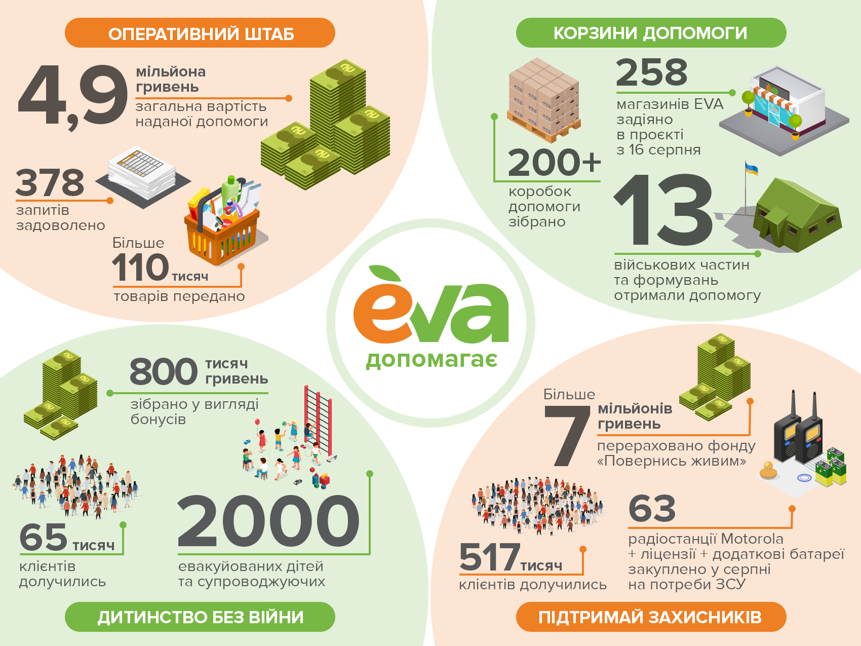 Оперативний штаб, організований у EVA 26 лютого, задовольнив вже 378 запитів на гуманітарну та соціальну допомогу зі 140 міст по всій Україні. За зверненнями представників ЗСУ, волонтерських та громадських організацій станом на 31 серпня передано понад 110 000 одиниць необхідних товарів на суму понад 4,9 млн грн.