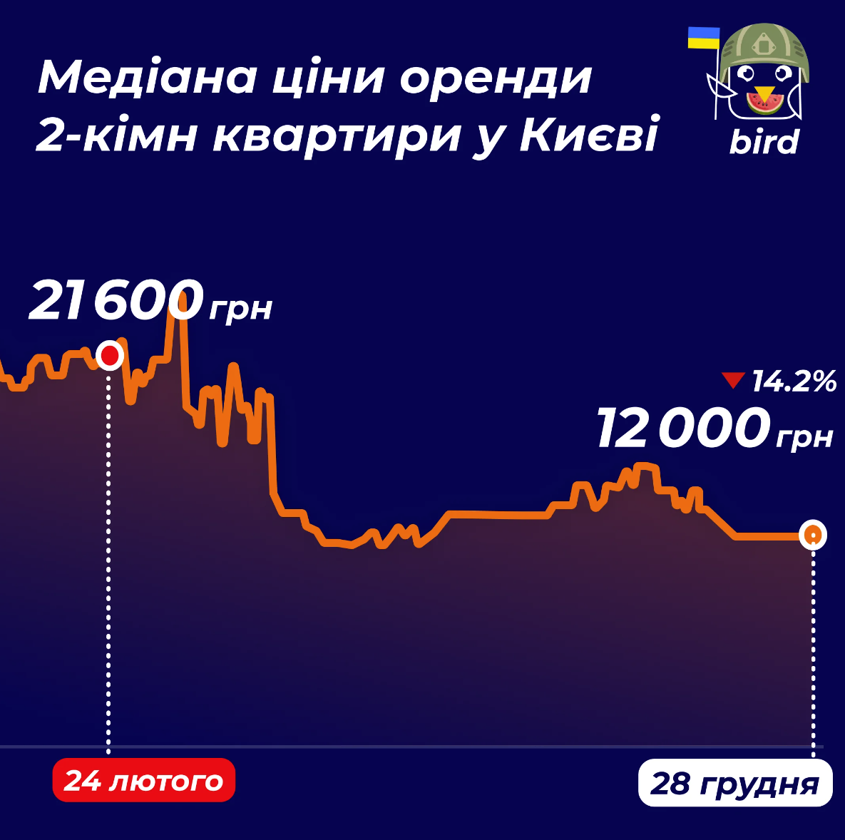 Вартість оренди знову впала на 10−15%, а попит трохи зріс, порівняно з груднем 2021 року — збільшився на 3%.