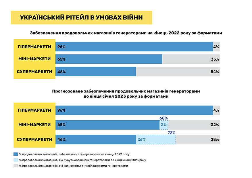 Найбільше генераторами обладнані гіпермаркети та мінімаркети: станом на кінець 2022 року пристроями автономного безперебійного електропостачання були облаштовані 96% та 65% відповідно. Найменш обладнаними генераторами були супермаркети: тут гарантувати роботу при відключенні світла могли лише 46% магазинів. Але до кінця січня 2023 року ситуація обіцяє покращитись: зокрема, мінімаркети планують додатково обладнати генераторами ще 3% магазинів, а супермаркети — 26% магазинів. Таким чином, вже на початку лютого 2023 року мінімаркети провідних торговельних мереж будуть забезпечені безперебійним автономним електропостачанням на 68%, а супермаркети — на 72%.