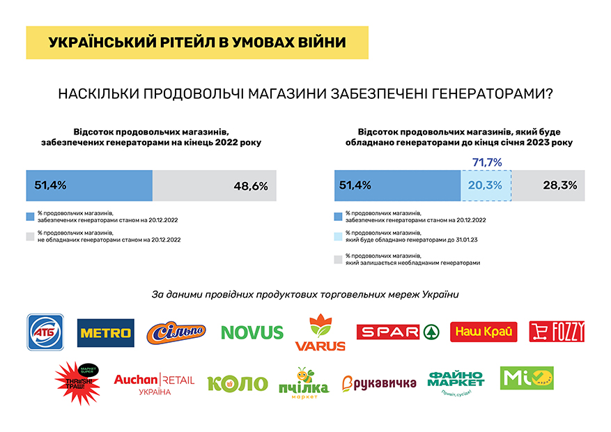 Станом на кінець 2022 року генераторами забезпечено 51,4% магазинів найбільших продовольчих мереж України. До кінця січня 2023 року автономними джерелами електроживлення будуть забезпечені ще 20,3% продовольчих магазинів, тобто показник торговельних точок, які зможуть безперебійно працювати під час відключень електроенергії, зросте до 71,7%.