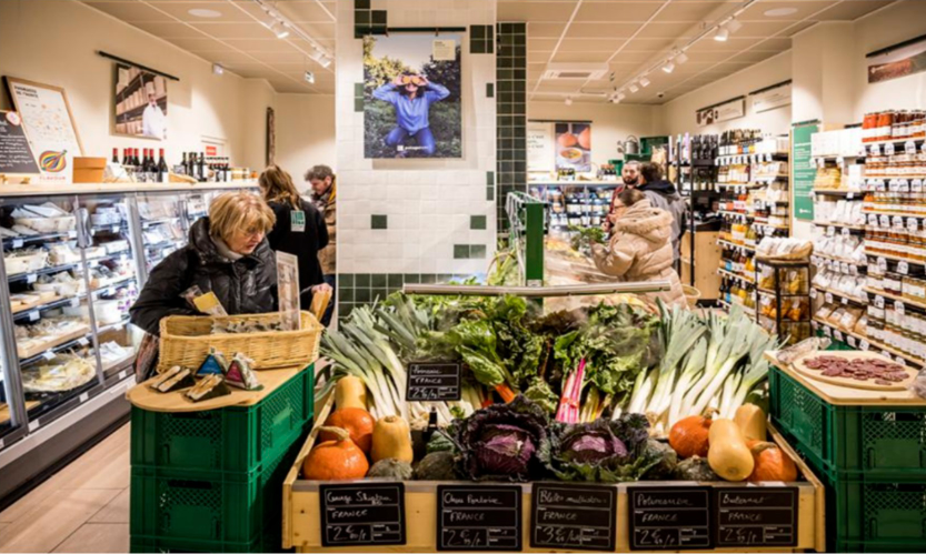Нова концепція магазину пропонує, зокрема, харчові продукти (до 170 найменувань), що постачаються компанією Omie & Cie, яка сприяє генеративному сільському господарству, спрямованому на відновлення ґрунту, вино (приблизно 40 позицій), що постачається у співпраці з Le Petit Ballon, а також свіжі та ультрасвіжі продукти, такі як сири, молочні продукти чи нарізки (близько 230 товарів).