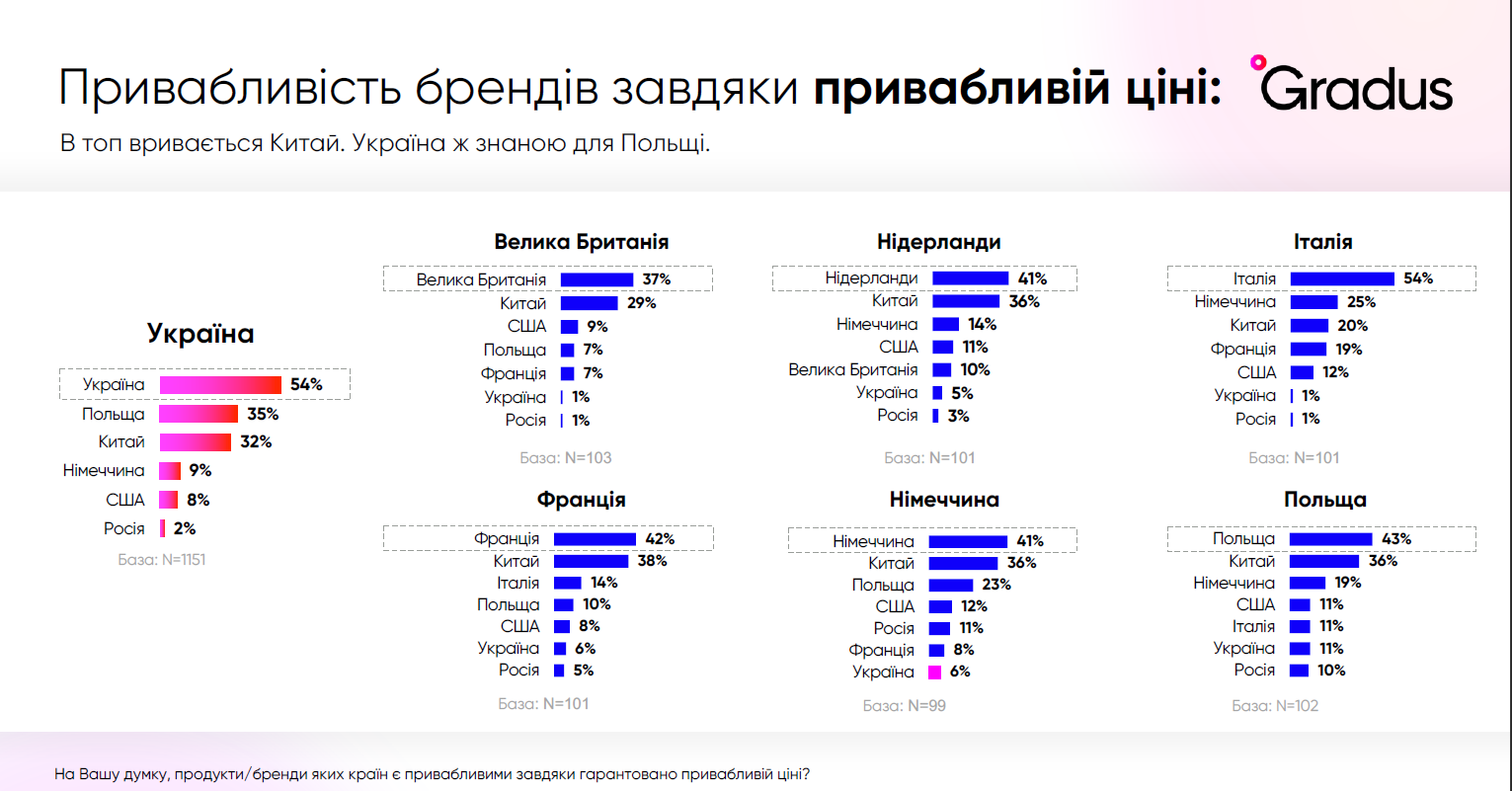 Привабливість брендів з боку доступності, дистрибуції — важливий фактор. І тут ми бачимо, що в Україні Україна, Польща та Китай є максимально високими та близькими категоріями. Натомість дистрибуція по іншим країнам залежить від конкретних компаній, окремих мереж, які розбудовані. Для Великої Британії це Китай та США, для Нідерландів — Німеччина та Китай, для Італії — США і Китай. Бачимо велику присутність Китаю ще й коштом онлайн торгівлі та інших каналів збуту, що заповнені китайськими товарами.