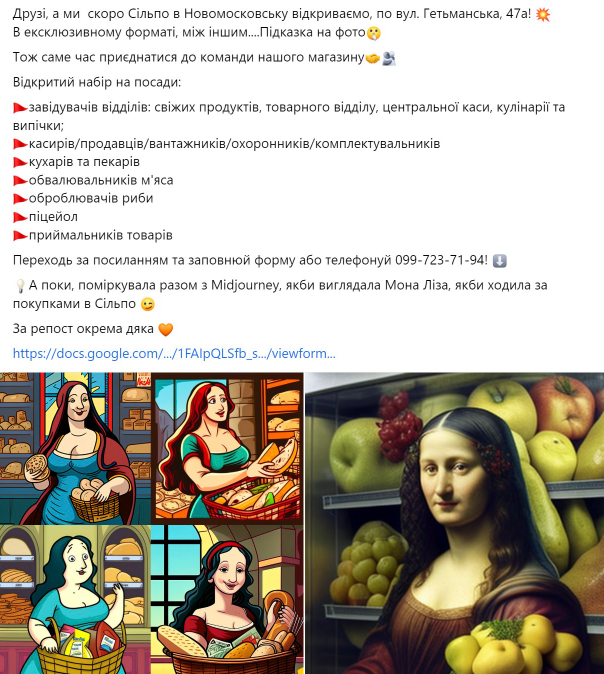 Дизайн нового супермаркету буде у стилі картини Леонардо да Вінчі «Мона Ліза», про що можна дізнатися з дописів у соцмережах співробітників департаменту персоналу Fozzy Group про пошук працівників.