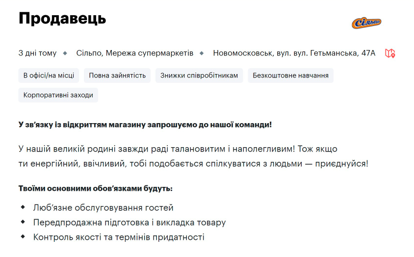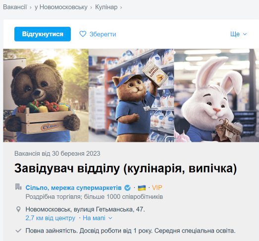 На вітчизняних сайтах з пошуку роботи з’являється все більше вакансій про пошук персоналу у Новомосковську — зокрема продавців, касирів, кухарів, обвалювальників м’яса та оброблювачів риби. Це буде перше відкриття «Сільпо» у Новомосковську (і взагалі перший магазин Fozzy Group у цьому місті).