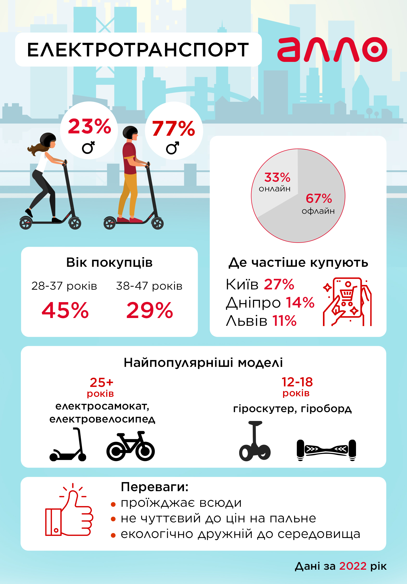 67% усіх продажів електротранспорту відбувається офлайн — у магазинах АЛЛО та АЛЛО МАХ, 33% покупців здійснюють замовлення онлайн — на allo.ua чи у мобільному застосунку.