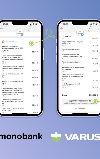 Мережа супермаркетів VARUS і мобільний банк monobank оголосили про початок партнерства. В рамках реалізації стратегії цифровізації VARUS реалізував відображення цифрових чеків у додатку monobank. Клієнти monobank, які купують у VARUS, отримують цифрові чеки прямо в телефоні.