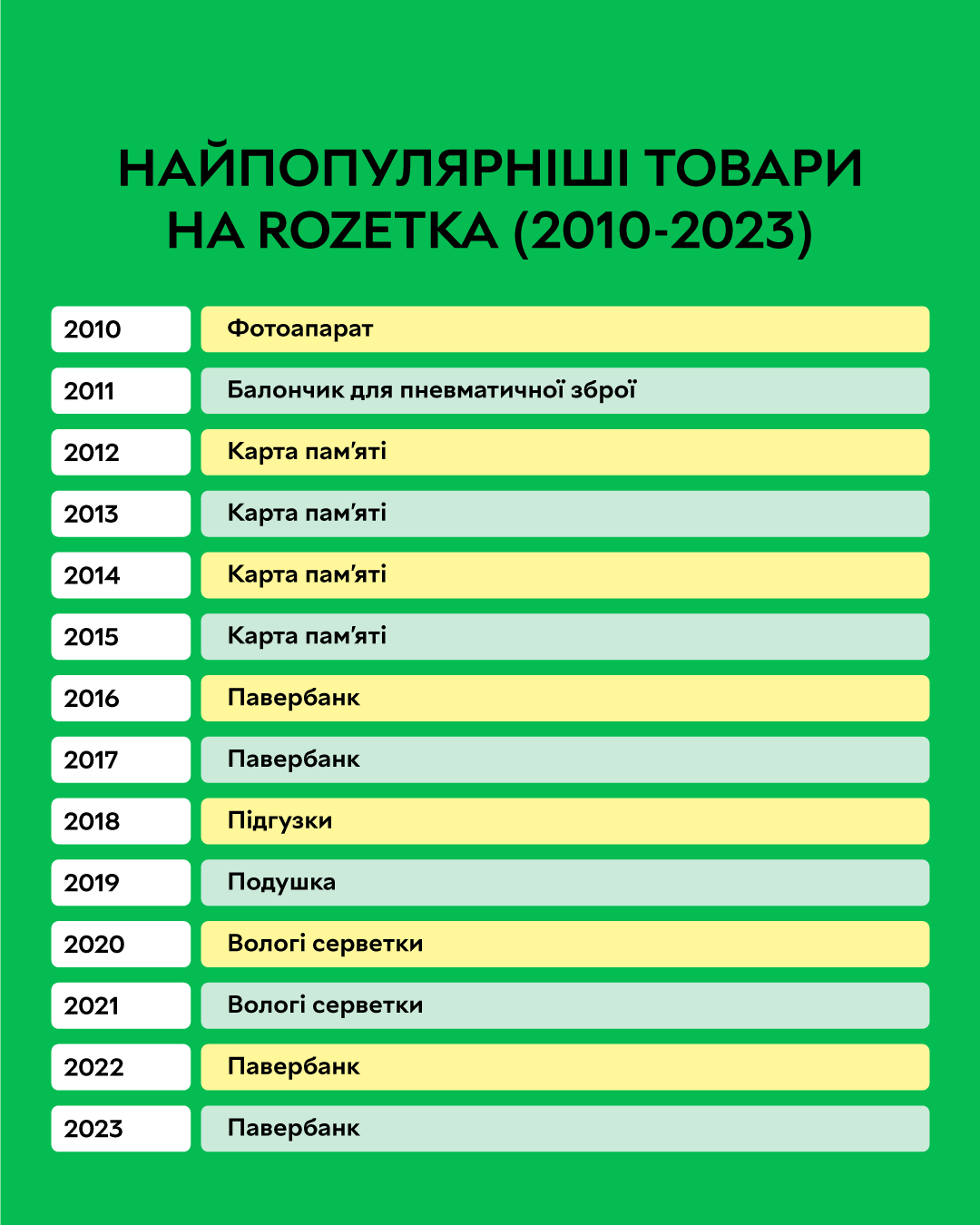 З-поміж конкретних товарів на Rozetka найбільшою популярністю найдовше користувалися карти пам’яті (2012-2015). У 2016-му їхнє місце посіли павербанки, які утримували позицію до 2018-го.