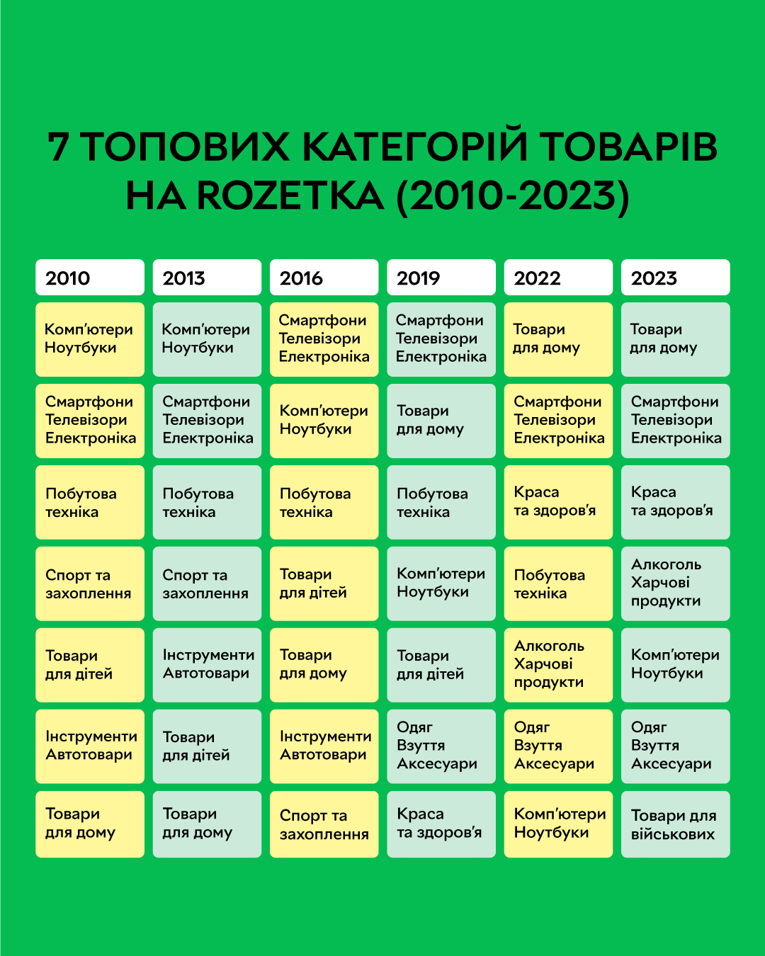 До 2016-го найпопулярнішою категорією товарів на сайті були комп’ютери та ноутбуки. Потім їх змінили смартфони, телевізори та електроніка, які раніше посідали другу позицію в рейтингу. А від початку повномасштабної війни у 2022-му найбільший попит серед усіх категорій мають товари для дому: посуд, побутова хімія, меблі, лампи та світильники, господарські товари, альтернативні джерела енергії тощо.