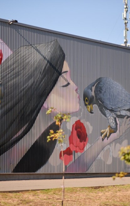Дівчина в оточенні маків. Вона тримає на руці сокола та тягнеться, щоб його поцілувати. Це — сюжет нового стінопису, намальованого на фасаді супермаркету VARUS у Дніпрі.