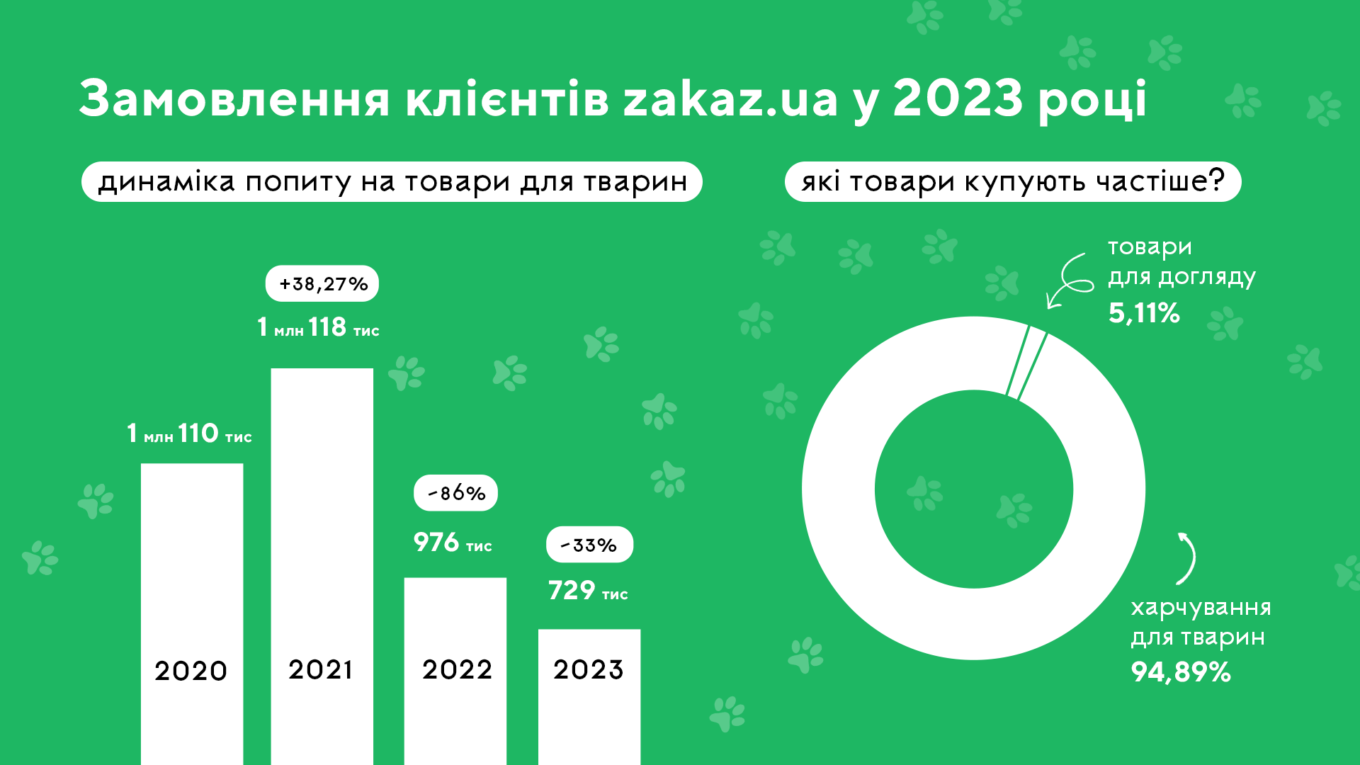 Що відбувається з попитом на товари для тварин в Україні? За даними Zakaz.ua, до 2022 року динаміка продажів стабільно зростала. Так, наприклад, у 2021 році попит зріс на 38% відносно 2020 року, через сервіс було продано 1 млн 118 тис. одиниць товарів для тварин. Проте з початком повномасштабної війни через міграцію та евакуацію великої кількості платоспроможних українців та їх хатніх улюбленців за кордон, динаміка попиту різко погіршилася — просіла у 2022 році на 86% відносно 2021.